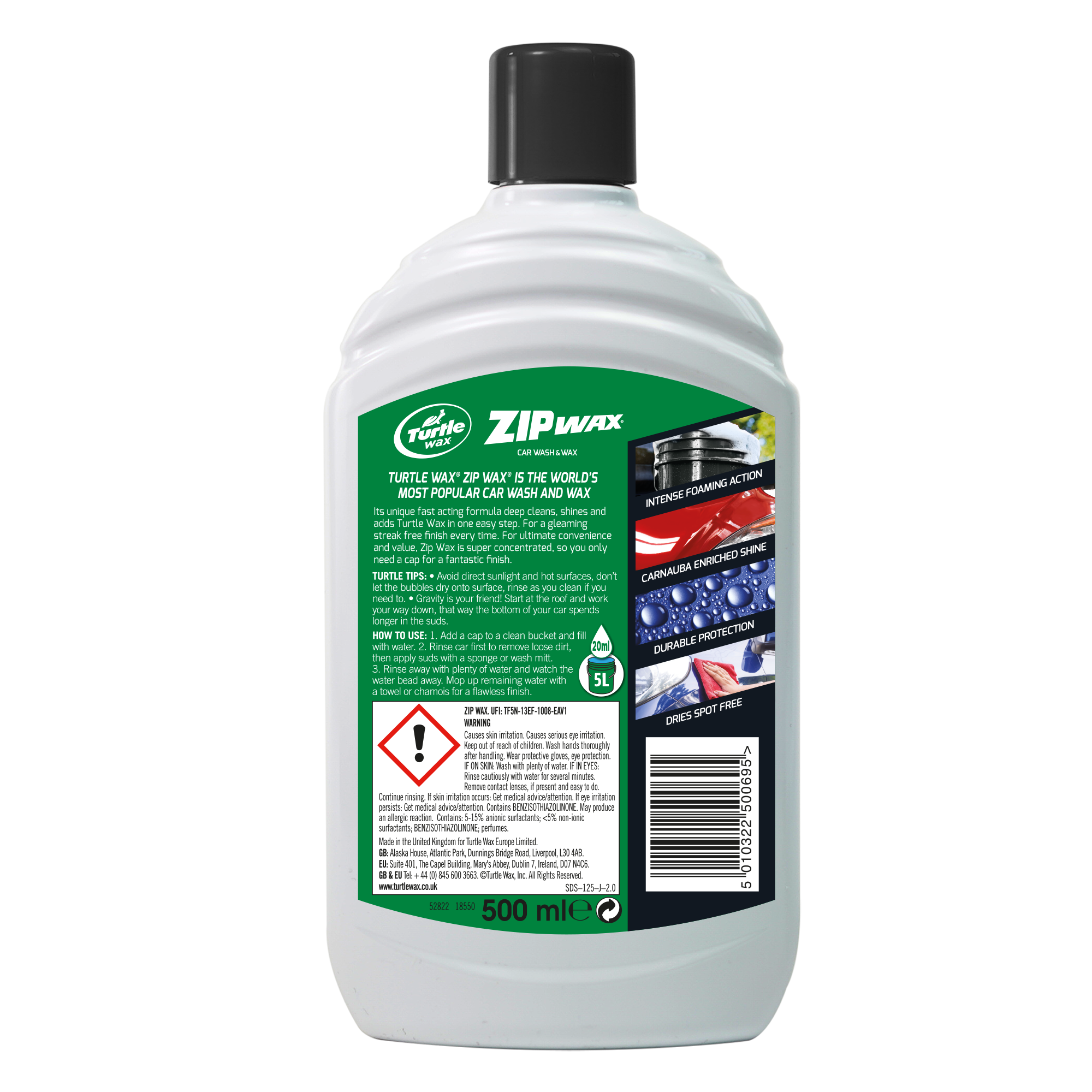Автошампунь з воском Карнауба Turtle Wax Zip Wax безапеляційно та безпечно розчиняє стійкі плями та забруднення та змивається без плям навіть на склі. Інноваційні активні мийні компоненти створюють густу та стабільну піну, що забезпечує гарну вкриваність поверхні кузова та дозволяє піні довше залишатись у своєму первинному стані, збільшуючи ефект миття. Шампунь містить спеціальні воскові компоненти, які обволікають частинки бруду, не даючи їм змогу прилипати до кузова знову в процесі мийки. Завдяки наявності у складі натурального бразильського карнаубського воску після миття на автомобілі утворюється шар насиченого воску для посиленого захисту та блиску.