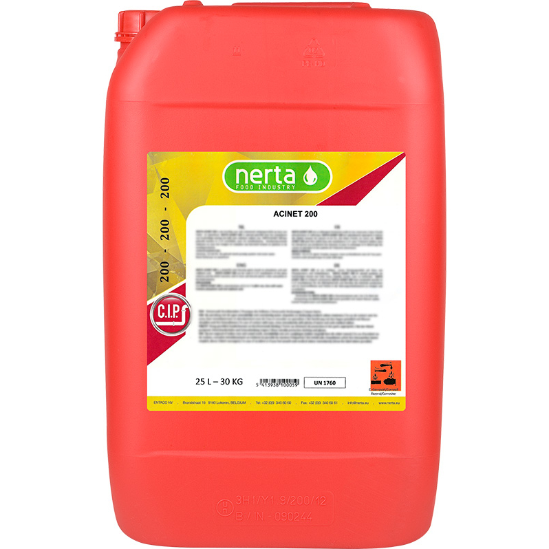 NERTA ACINET 200 – сильноконцентрований очищувальний засіб з низьким вмістом піноутворюючої кислоти і сильним дезінфікуючим ефектом, що підходить для очищення і видалення накипу CIP – установок.